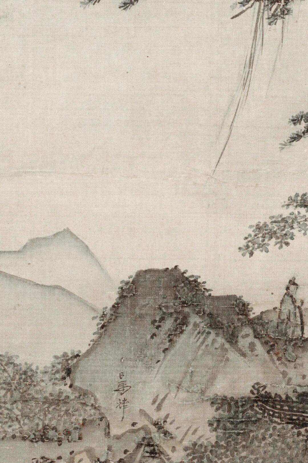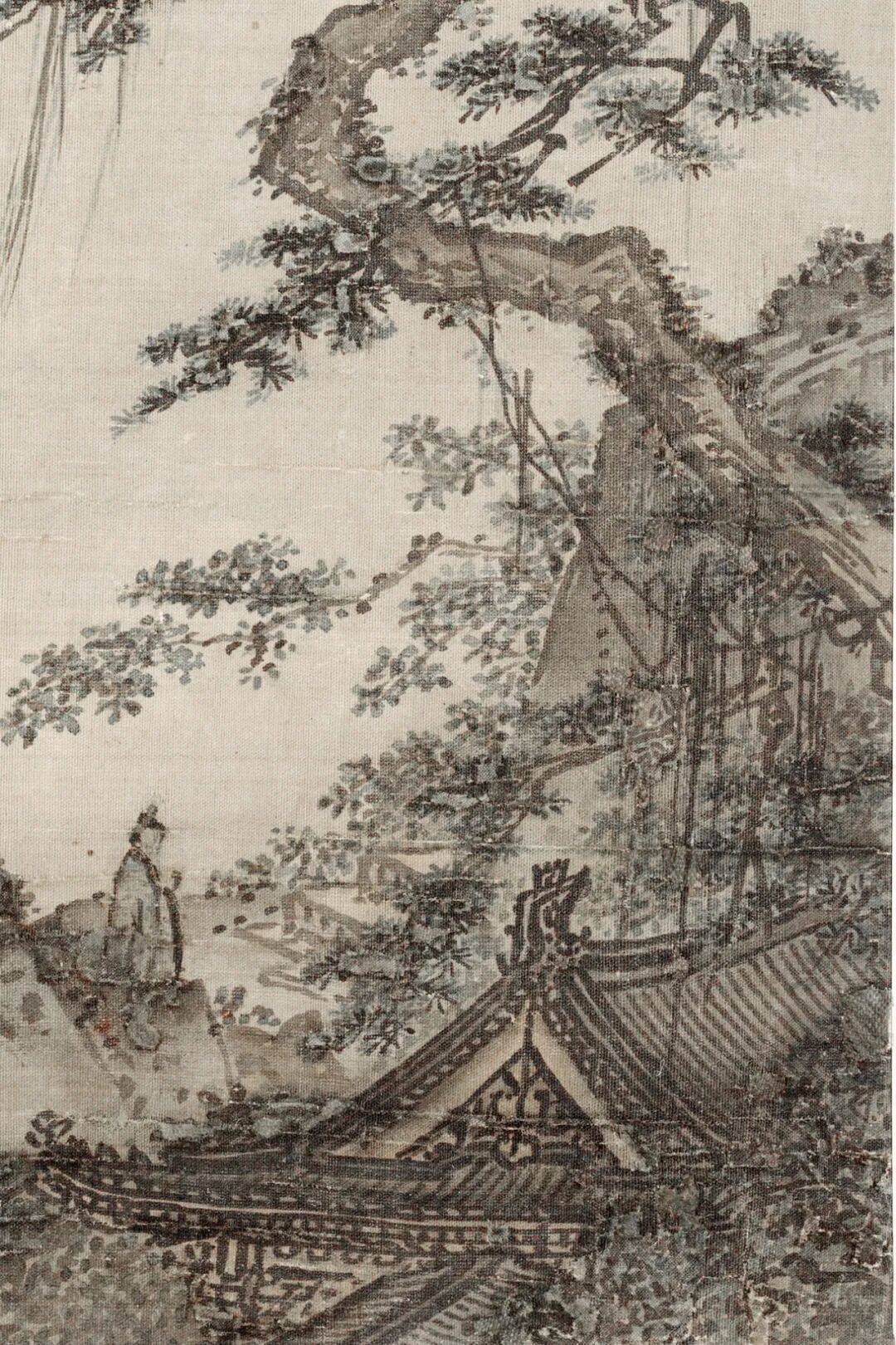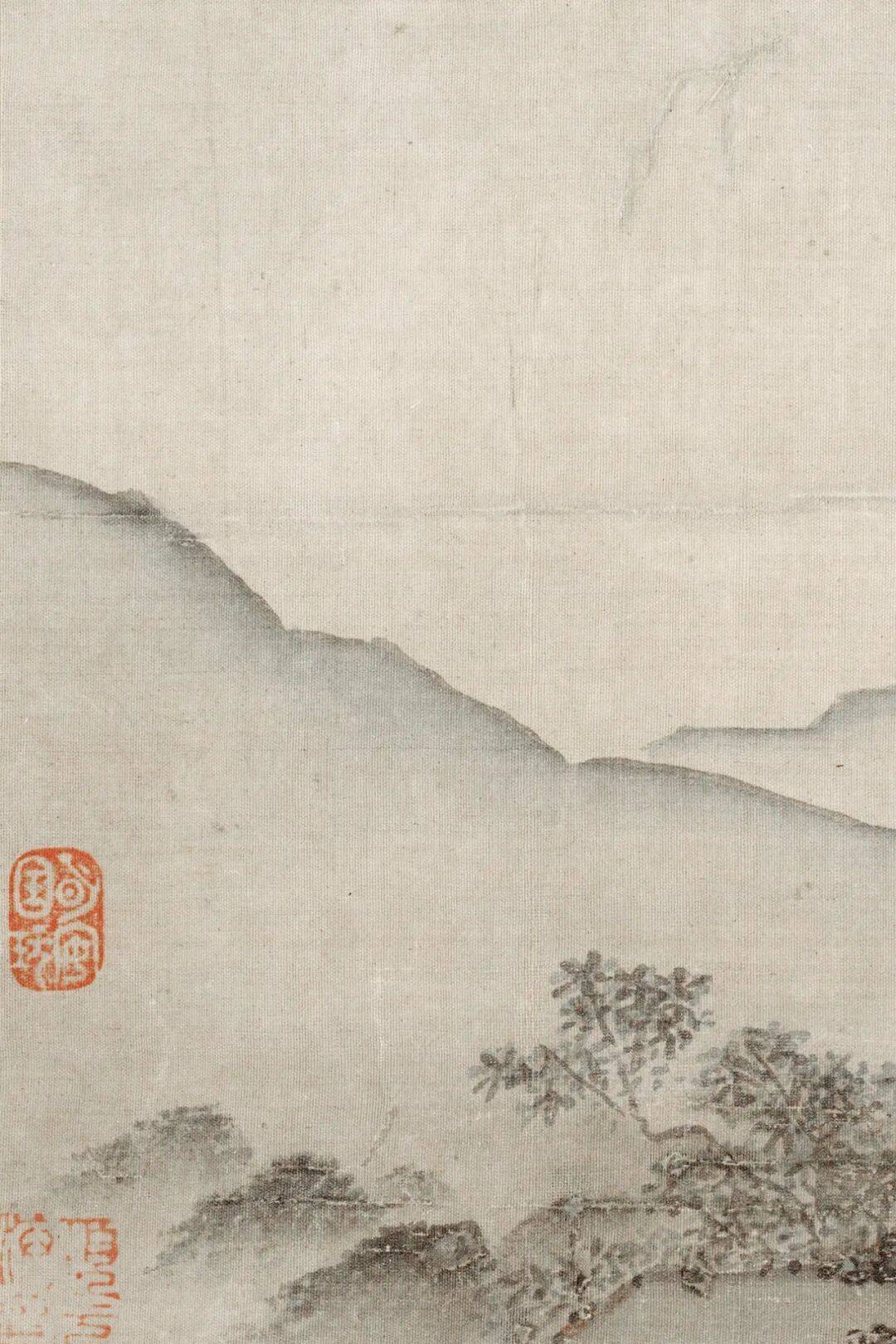 南宋画家马麟的《长松山水图》以绢本为载体,将一株长松化作时空的纽带,在25.1cm×26cm的方寸间展开一场虚实交织的哲学实验。画面下半部以山崖、松林为实,上半部以远山、云雾为虚,中间以挺拔长松衔接,形成“由实入虚”的三段递进——写实的建筑、虚实相间的山石、淡远的山峦,共同构建出高处的平远构图。这种构图并非简单的空间分割,而是对“道”的隐喻:长松如中庸之道,连接具象与抽象,现实与超验。