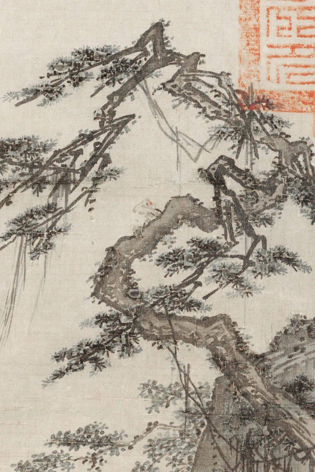 山石以小斧劈皴简笔勾勒,却通过点染的浓淡变化赋予层次,暗合道家“有无相生”的辩证。最精妙处在于中央摇曳的藤蔓——它不仅是视觉焦点,更是“气”的具象化。藤蔓随风而动,将静态画面转化为动态能量场,仿佛能听见松涛与山风的对话。